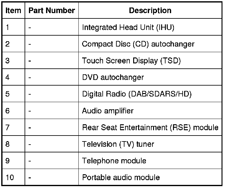 The Integrated Head Unit (IHU) is located behind the glove compartment mounted CD autochanger. The IHU is secured to the instrument panel support frame. The IHU contains the radio functionality for the audio system and communicates on the MOST ring with the components in the audio system. The IHU is also the timing master for the MOST ring. The IHU is the controls and manages the MOST ring and provides the allocations of channels, system power management and the functionality and co-ordination of the other system components.