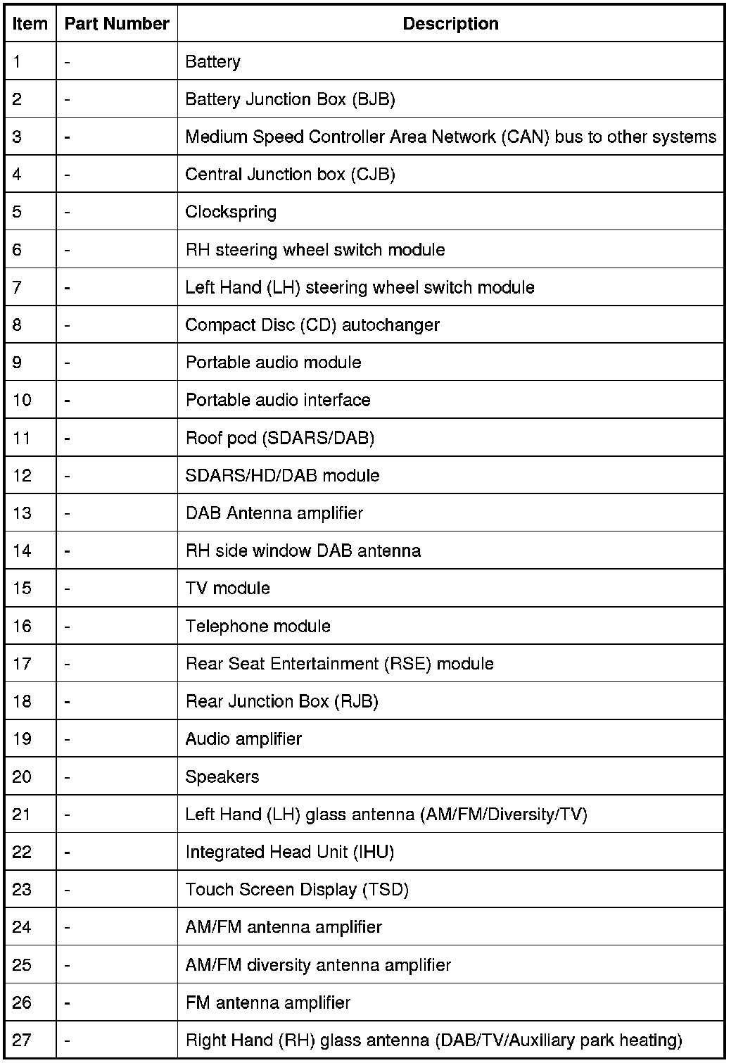 - DAB band III antenna located in the RH rear side window.