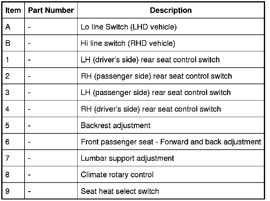 The switches for electrically adjusting the rear seat backrest are located in the rear door trims. Two versions of the switch are available; one lo-line switch with one switch for rear back rest adjustment and one switch with rear back rest adjustment, lumbar adjustment and a rotary switch for climate control. The switch corresponding to the front passenger seat is fitted with a front seat forward/backwards switch to allow for legroom adjustment.