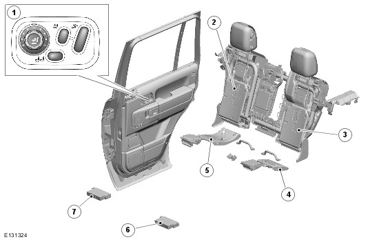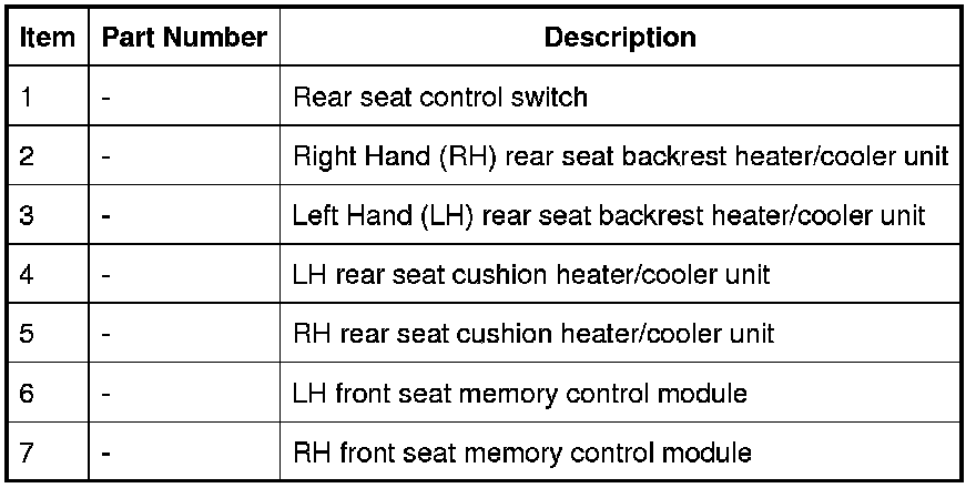 On vehicles with electric and climate controlled rear seats, the power supplies for the motors and climate functions are supplied from the front seat memory control module. On vehicles with a passenger front seat without the memory function, the seat memory control module is still fitted to the front passenger seat to supply the power for the passenger side rear seat functions. The seat memory control module is connected to the rear seat control switch and controls the movement of the rear seat via hard-wired connections to the motors.