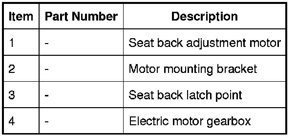A motor and gearbox located in each of the rear seat backrest latches adjust the rake of the backrest in response to a request from the door switch pack. The switchpack receives a power supply from the CJB (central junction box). When a switch is operated the switch pack outputs a message on the LIN (local interconnect network) bus to the applicable front seat memory control module. The memory module then outputs the required power supplies to the seat motors to power them to the required position.