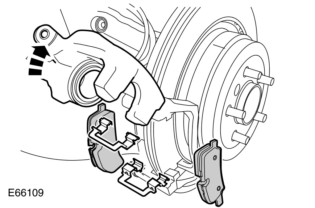 CAUTION: If installed, the adhesive strips covering the outer brake pads must be removed before installation. Failure to follow this instruction may result in damage to the vehicle.