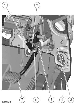 The brake pedal is mounted in a bracket attached to the rear side of the engine bulkhead. A clevis pin and clip connect the brake pedal to the push rod of the brake booster.