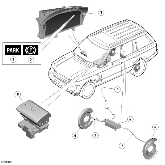 - The instrument cluster, to illuminate the red parking brake warning indicator. The indicator is permanently illuminated except in fallback 3, when it flashes.