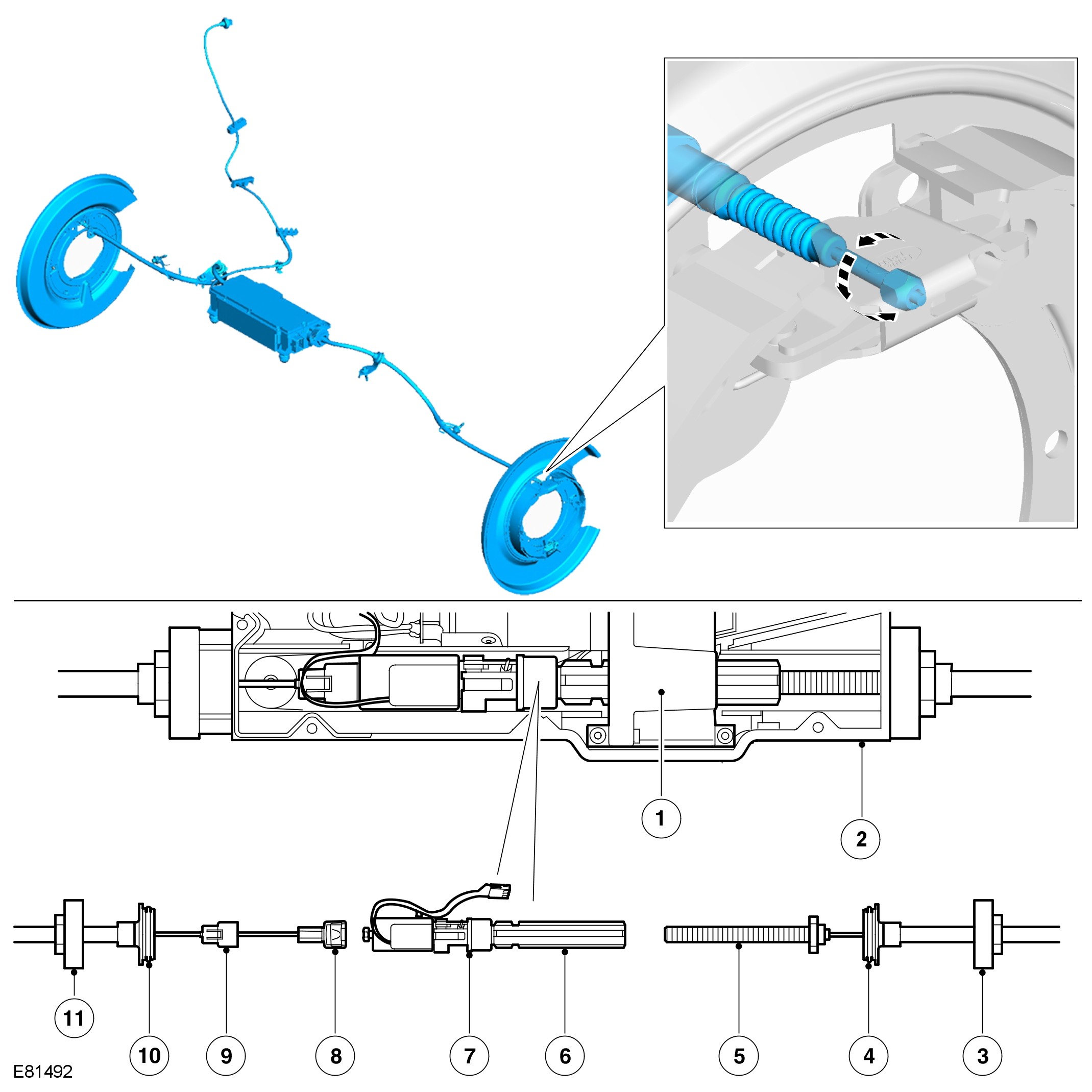 To apply or release the drum brakes, the parking brake module controls the operation of the electric motor to drive the gearbox. The gearbox rotates the splined shaft to increase or decrease the tension in the brake cables. The parking brake module monitors the load exerted by the brake cables using the input from the force sensor.