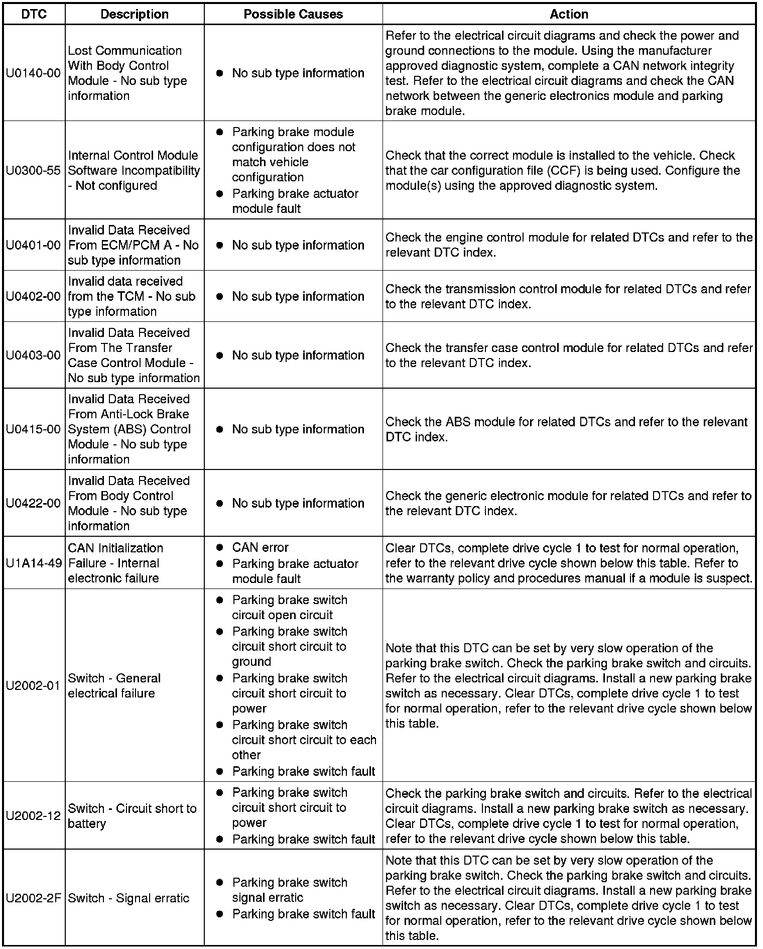 The table below lists all Diagnostic Trouble Codes (DTCs) that could be logged in the Parking Brake Module, for additional Diagnosis and Testing information refer to the relevant Diagnosis and Testing Section. For additional information, refer to Parking Brake