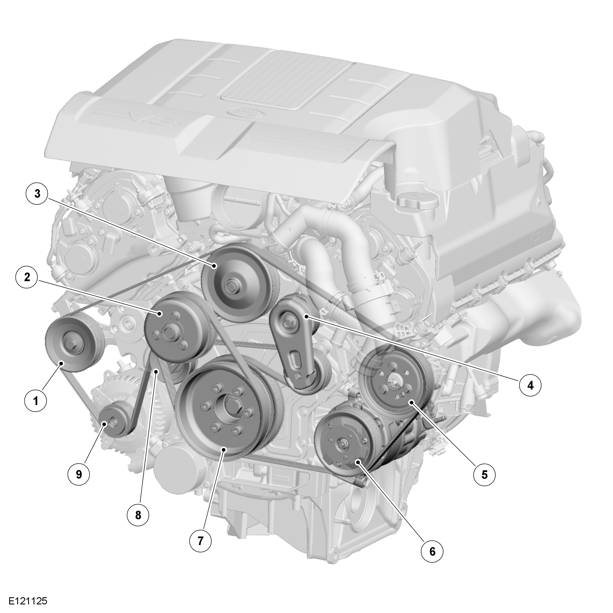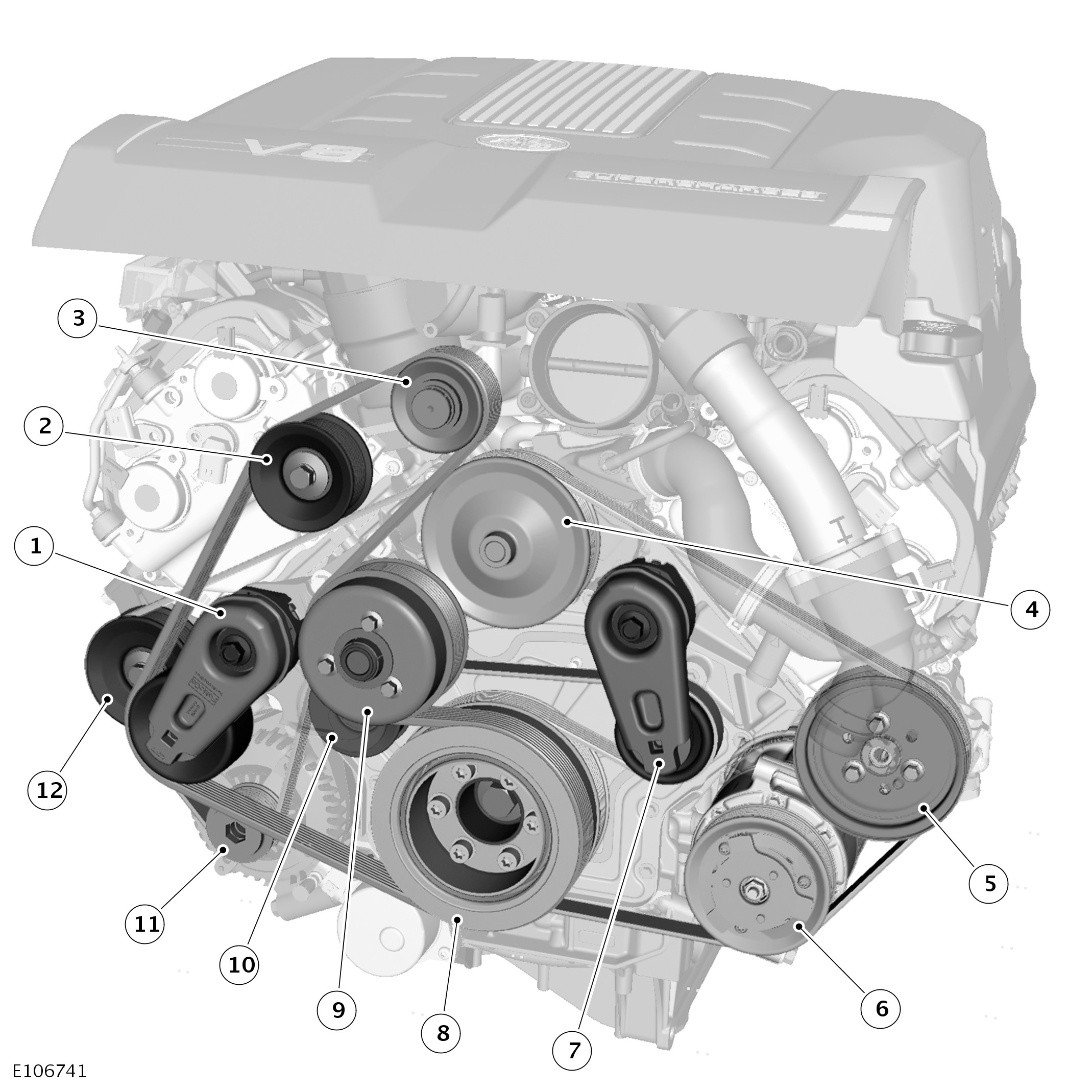 The accessory drive is a belt system powered by a pulley attached to the front of the crankshaft. The crankshaft pulley, which incorporates a torsional vibration damper, drives primary and secondary drive belts. An automatic belt tensioner in each belt run maintains the drive belts at the correct tension. Together with idler pulleys, the belt tensioners also guide the drive belts clear of obstructions and set the correct 'wrap-around' of the accessory component drive pulleys to ensure a slip-free drive.