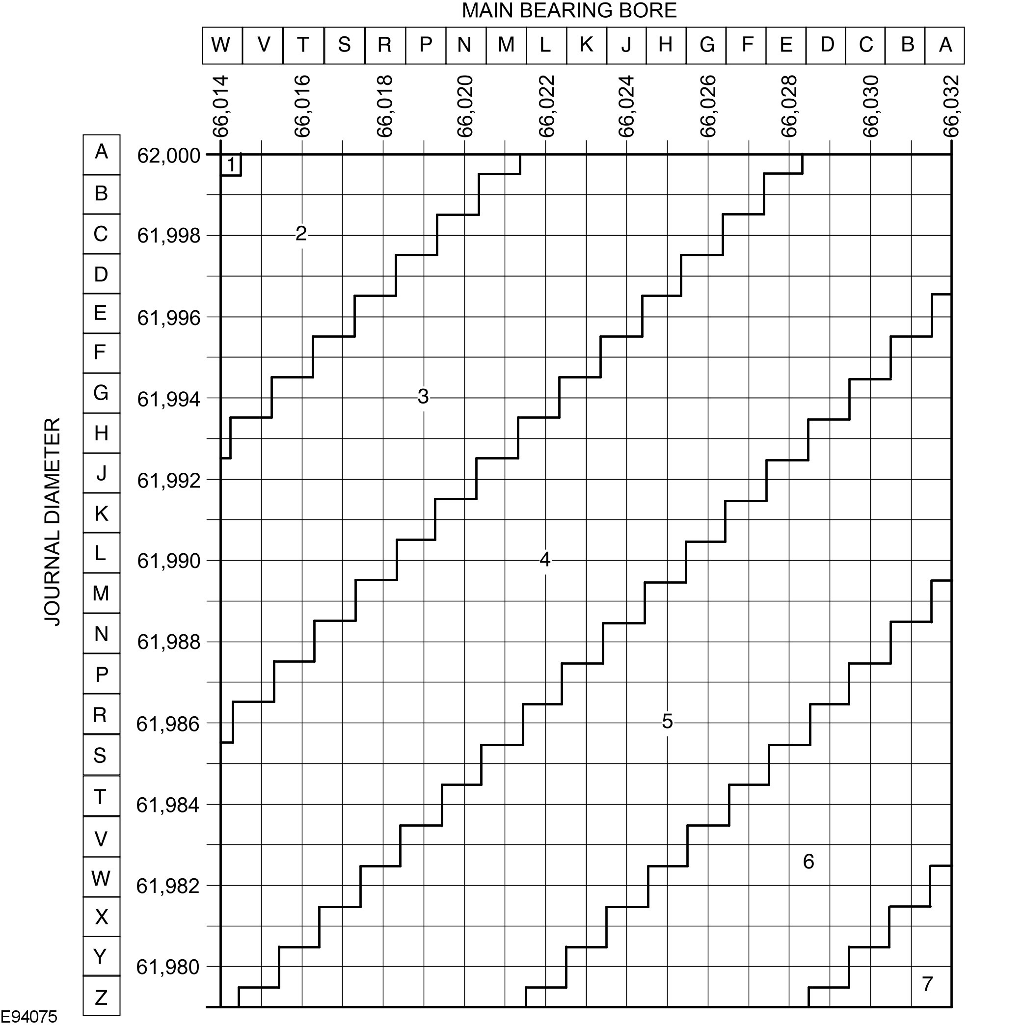 - Consider crankshaft journal 5 (from the example grade markings on the cylinder block) - the cylinder block bore is Grade N and the crankshaft journal diameter is Grade L. From the chart, it will be seen that the point of intersection is in Band 4 which equates to one Blue shell and one Green shell.