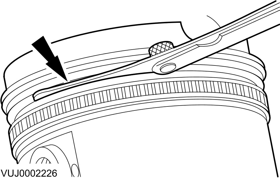 The piston ring must protrude from the piston groove. To determine the piston ring clearance, insert the Feeler Gauge right to the back of the groove, behind the wear ridge.