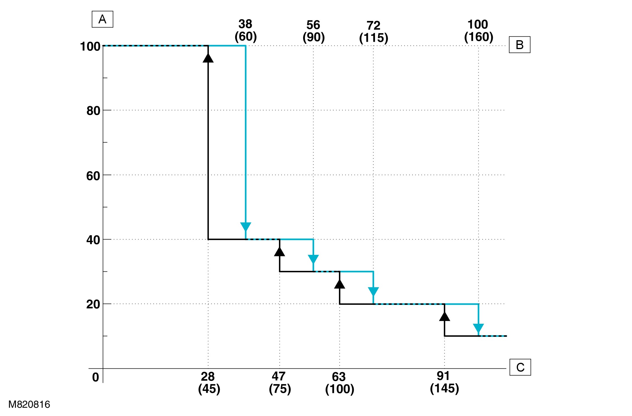 A = Door position, % open; B = Opening speeds, mph (km/h); C = Closing speeds, mph (km/h)
