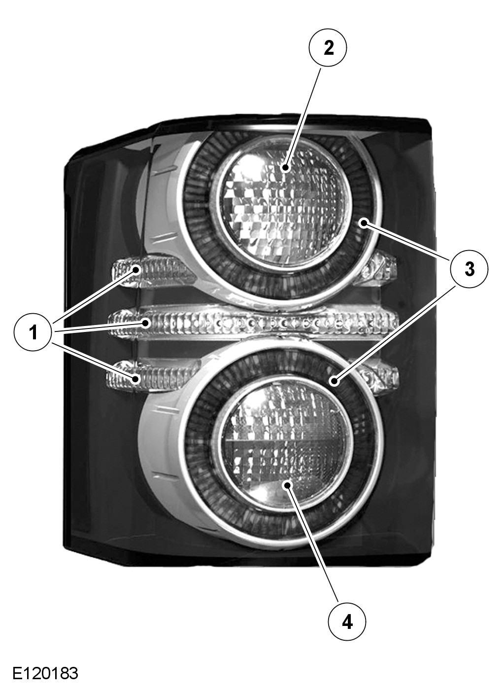 All lamps in the tail lamp assembly use LED's's. The stop lamp is located in the upper section of the lamp assembly and is illuminated by 19 LED's. Surrounding the stop lamp is the upper tail lamp which is illuminated by 9 LED's. The rear fog lamp is located in the lower section of the tail lamp assembly and is illuminated by 3 high power LED's. Surrounding the fog lamp is another circular ring of 12 LED's which function as the lower tail lamp. The turn signal indicators are 3 horizontal strips located between the upper and lower tail lamps and are illuminated by 12 LED's.