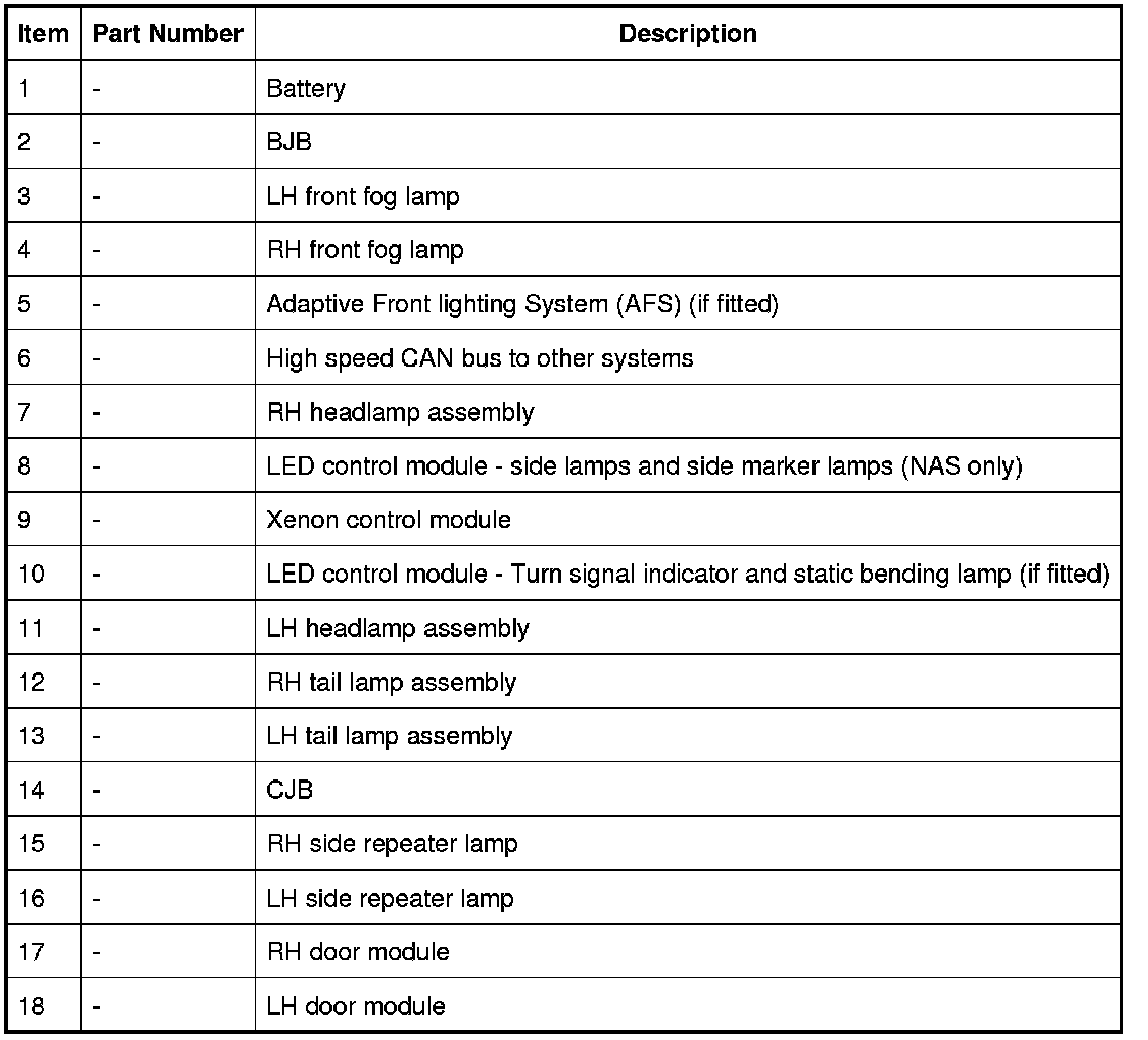 The warning indicators in the instrument cluster for left and right turn signal indicator, front and rear fog lamps and headlamp low and high beam and side lamps are activated by the CJB via messages to the instrument cluster on the medium and high speed CAN buses. The synchronization of the turn signal warning indicator with the external turn signal indicator lamp frequency is controlled by a cyclic transmission of the light status on the medium speed CAN bus.