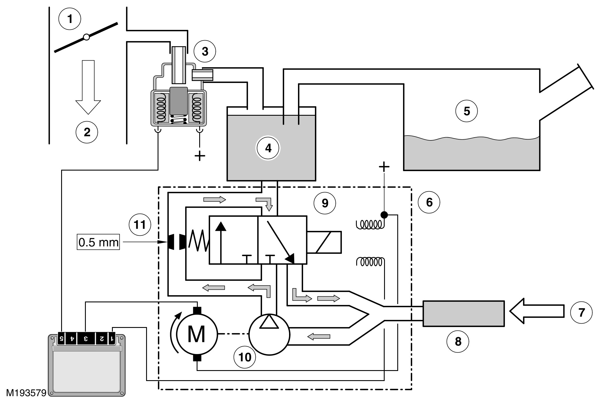 The DMTL pump is located at the top of the fuel filler pipe, on a bracket near to the filler neck. The pump is connected by a pipe to the atmospheric vent of the charcoal canister and incorporates a PTC (positive temperature coefficient) heating element, a normally open valve and a reference orifice. The DMTL pump is only operated when the ignition is switched off and is controlled by the ECM (engine control module). The ECM (engine control module) also monitors the electric air pump operation and the normally open valve for faults.