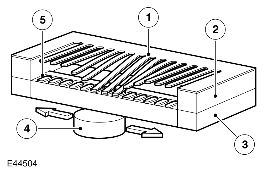 The film resistors are arranged in a linear arc with resistance ranging from 51.2 to 992.11 Ohms. The electrical output signal output is proportional to the amount of fuel in each side of the tank and the position of the float arms. The measured resistance is processed by the instrument cluster to implement an anti-slosh function. This monitors the signal and updates the fuel gauge pointer position at regular intervals, preventing constant pointer movement caused by fuel movement in the tank due to cornering or braking.