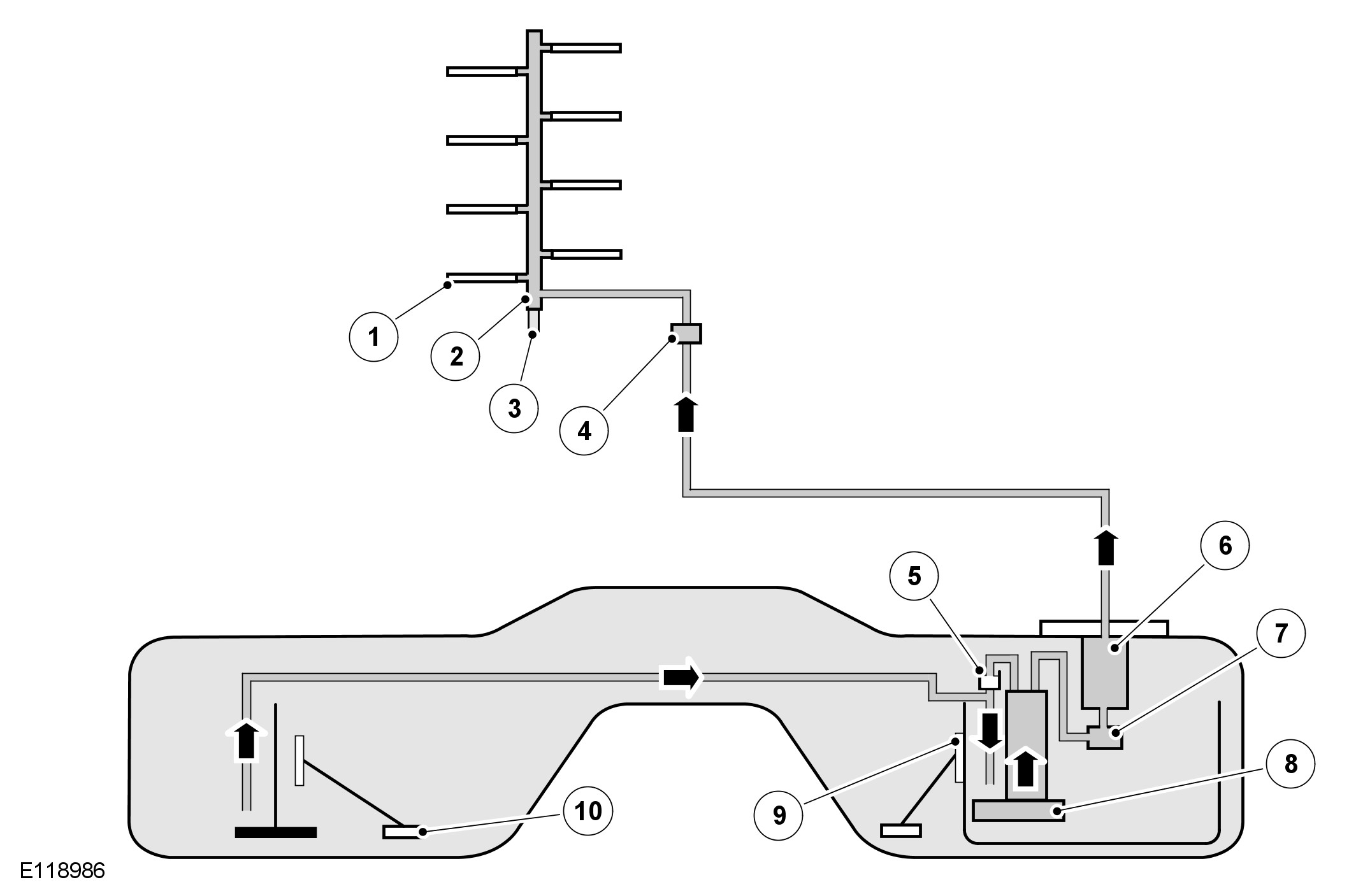 The fuel system incorporates two jet pumps. One jet pump is integrated into the fuel pump and draws fuel from the RH (right-hand) side of the fuel tank. The other jet pump is located on the fuel delivery module on the RH (right-hand) side of the tank. There is a pipe that is located in the LH (left-hand) side of the tank that allows fuel to be drawn over from the LH (left-hand) side of the tank, delivering fuel into the swirl pot. The jet pumps operate on a venturi effect created by the fuel at pump output pressure passing through the jet pump. This draws additional fuel from the LH (left-hand) side of the tank through ports in the jet pump body, delivering additional fuel to the swirl pot.