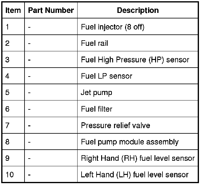 The major components of the 5.0L V8 fuel system comprises a fuel tank, a fuel delivery module, a fuel filler assembly and two fuel level sensors.