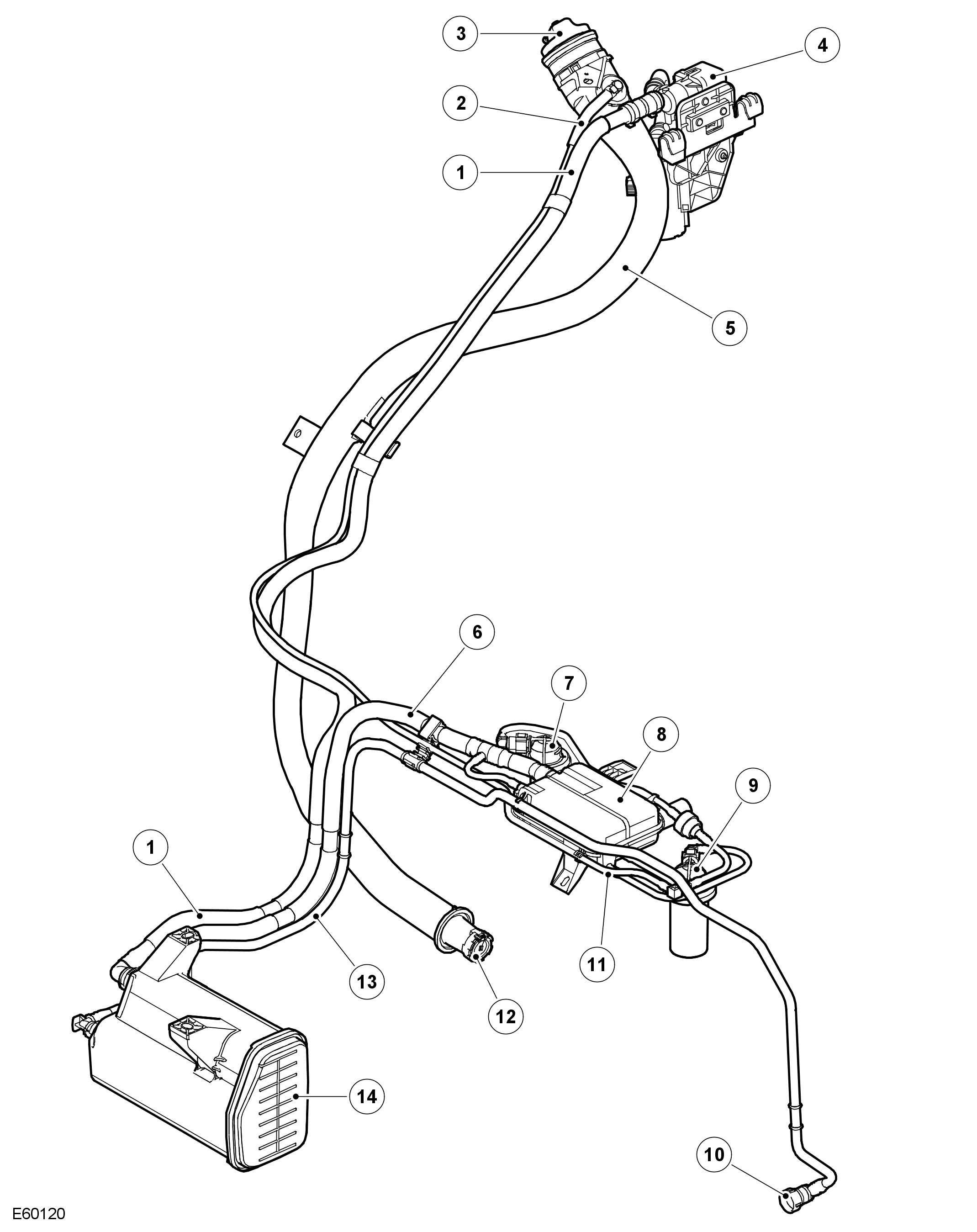 The outer surface of the flange has two outlets with quick-fit connections. One connection is the pressure outlet to the fuel rail, the second outlet is the fuel supply to the Fuel Fired Booster Heater (FFBH) pump, if fitted. For additional information, refer to Auxiliary Heater An electrical connector is located adjacent to the pipe connections and provides the electrical interface to the fuel pump and the level sensors.