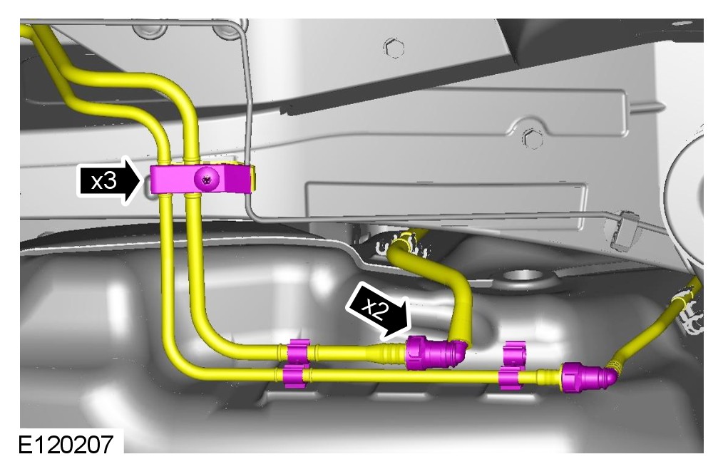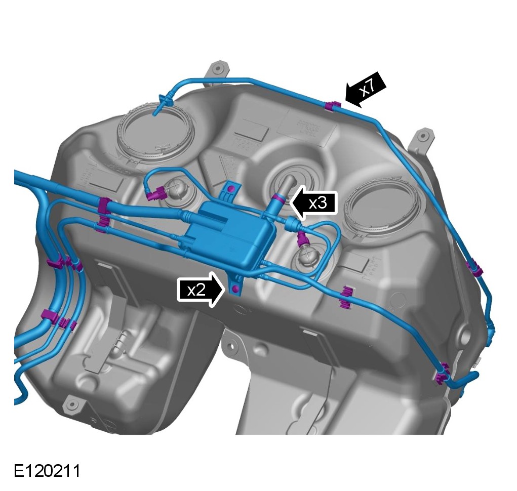 CAUTION: Position the breather hose and vent hose through the vehicle body during the fuel tank removal operation.