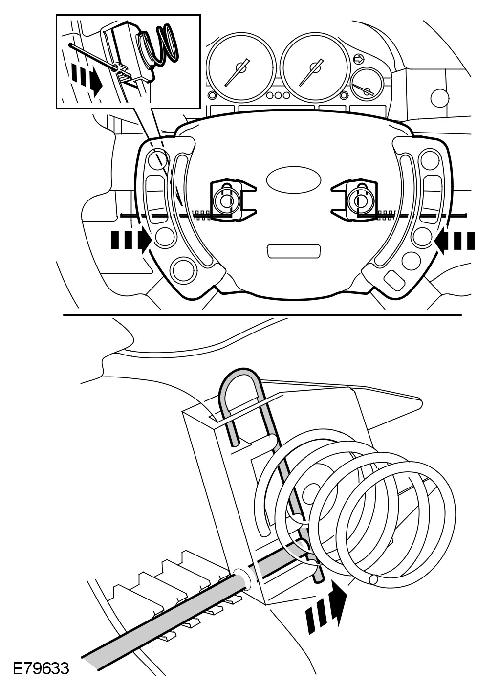 3 Release the 2 clips from the driver air bag module using a rod at least 50 mm (2 inches.) long and not exceeding 3 mm (1/8 inch.) diameter. Install the rod through each access hole in the steering wheel control switches at right angles to the steering column. Locate the secondary hole and carefully push on the rod until the clip is released.