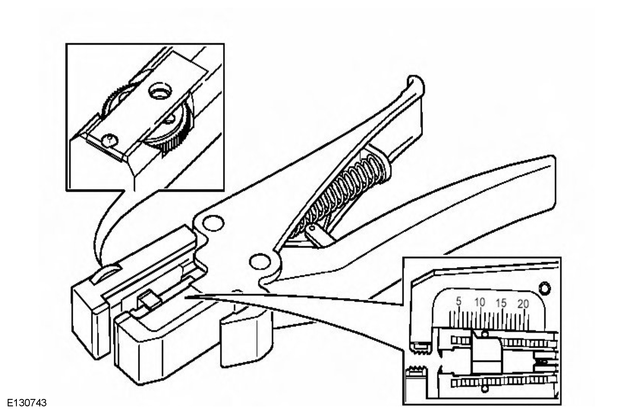 The moving jaw has an adjuster wheel which has a series of holes in it. Turning the wheel and placing the cable in the matching size hole will automatically adjust the jaw to the correct pressure. Note that some wiring harness(s) may have a harder insulation and slight adjustment of the wheel may be needed to make a clean strip but exercise care not to damage the wire.