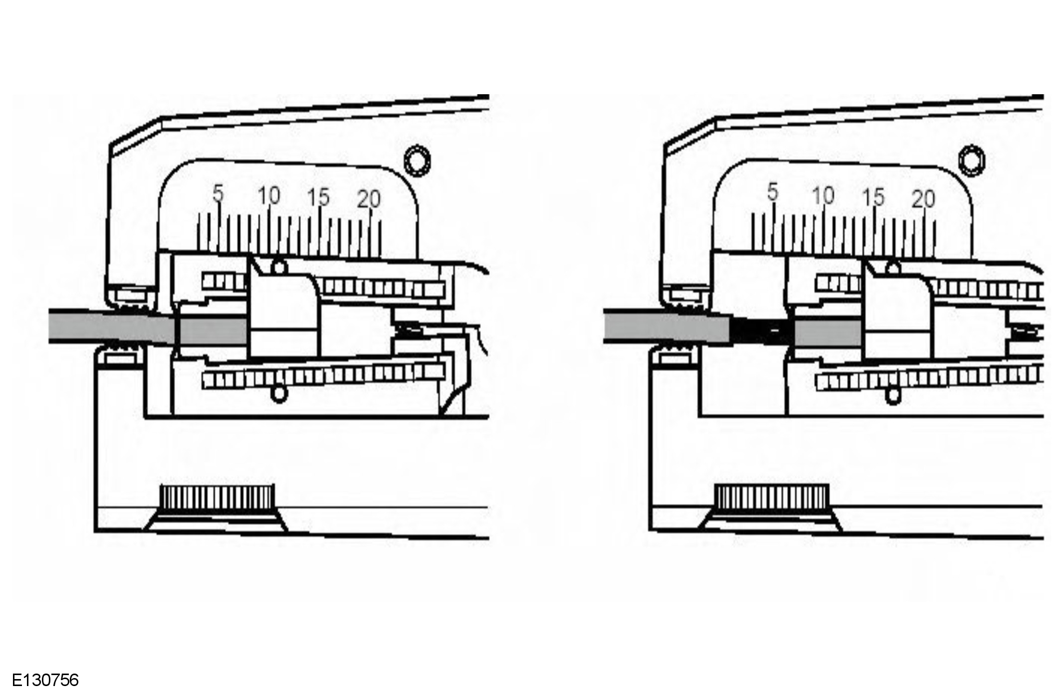 By pressing the outer edges of the wiring harness cable length stop together the adjuster can be slid up or down the jaw. This decreases or increases the length by which the wiring harness cable insulation will be stripped from the pre-terminated wiring harness or wiring harness wire. The adjuster has a position indicator to align with a graduated scale and this sets the correct length in millimeters, of insulation to be stripped. The amount of insulation to be stripped is shown in the Relationship Table.
