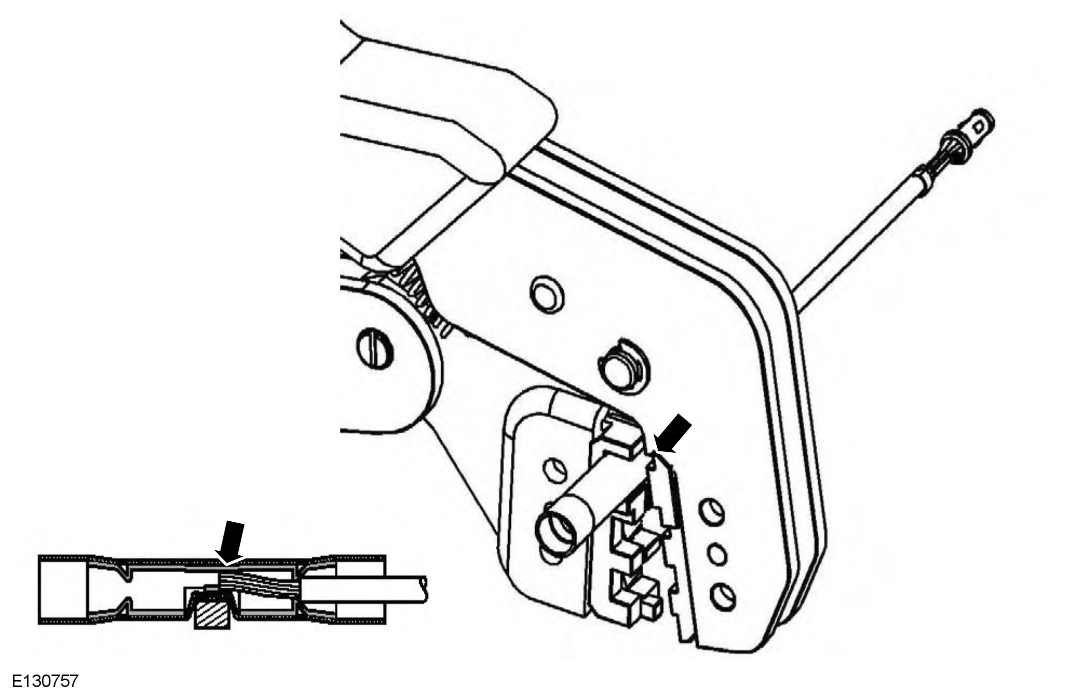 Insert the pre-terminated wiring harness into the butt connector and make sure that the wire is against the wire stop. Close the grip firmly, crimping the lead to the butt connector. When the handles have been completely closed the butt connector will be freed from the tool as the handles are released. If the handles have not been completely closed then the jaws will hold the butt connector and it cannot be removed from the tool until the crimp is fully made by closing the handles completely.