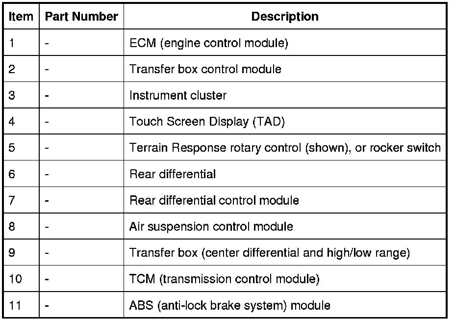 The Terrain Response system uses a combination of a number of vehicle subsystems to achieve the required vehicle characteristics for the terrain selected. The following subsystems make up the Terrain Response system: