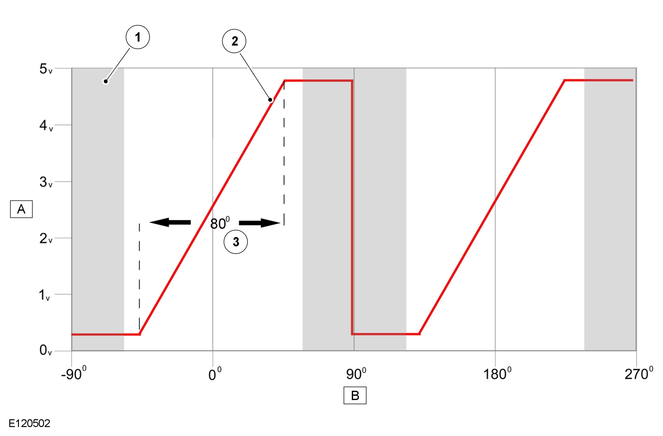 The sensing element consists of an array of hall effect devices arranged to measure the direction of the magnetic field of a small magnet attached to the end of the sensor shaft. As the sensor shaft rotates, so do the lines of magnetic flux from the magnet. The signals from the Hall effect elements are processed by means of a dedicated integrated circuit to generate an output voltage that varies as the sensor shaft is rotated. The sensor has a measurement range of ± 40° around its nominal position and the nominal sensitivity is 57 mV/° of shaft rotation. The graphic below [Fig:9] describes the repetition of the output signal as the sensor is rotated through and beyond 40°