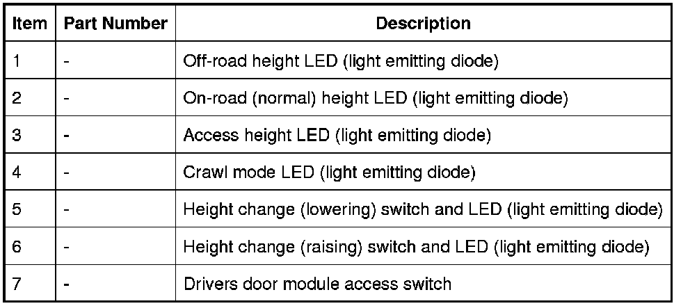 When the suspension is in off-road mode height, pressing the 'Access' height change switch once, or pressing the lowering switch twice before the lowering LED (light emitting diode) is extinguished, the control module will lower the suspension to access mode height. The control module will remember to return the suspension to off-road height automatically if the vehicle speed increases above 6.2 mph (10 km/h).