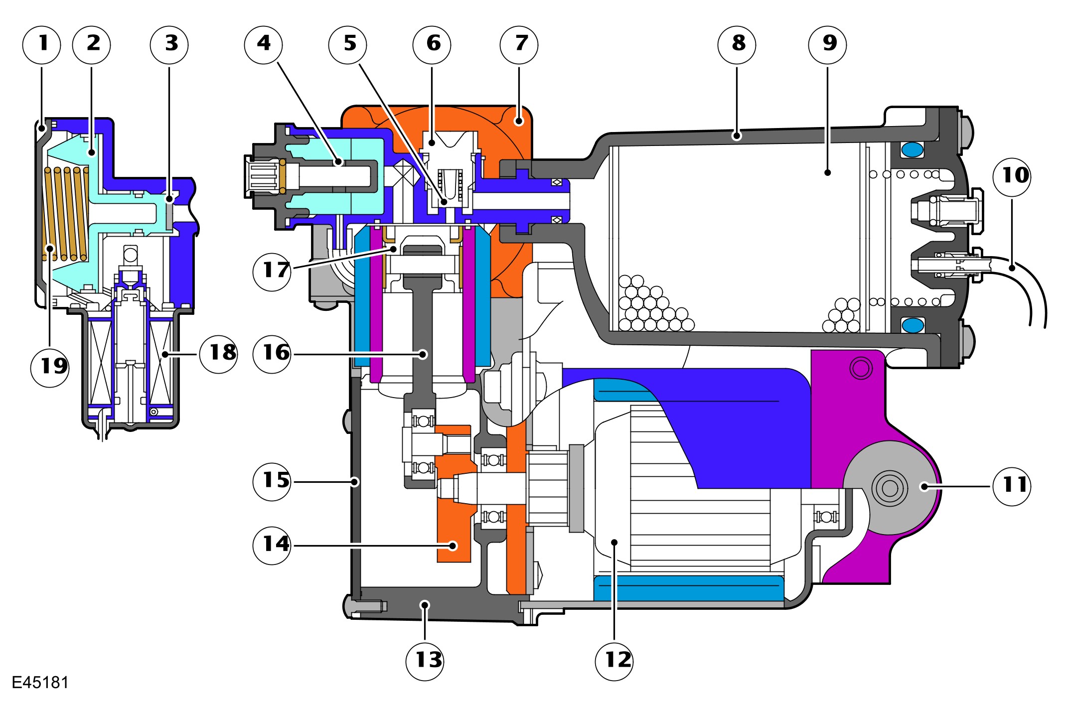 The compressor is used to supply air pressure to the air suspension reservoir. The air suspension control module monitors the pressure within the reservoir and, when the engine is running, maintains a pressure of 14.5 bar gage (210 lbf/in2).