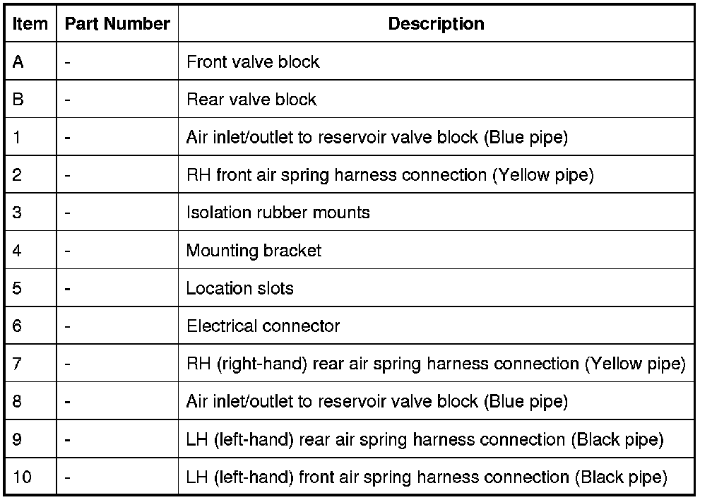 Each valve block contains three solenoid operated valves; two corner valves and one cross-link valve. Each of the valve solenoids is individually controlled by the air suspension control module.