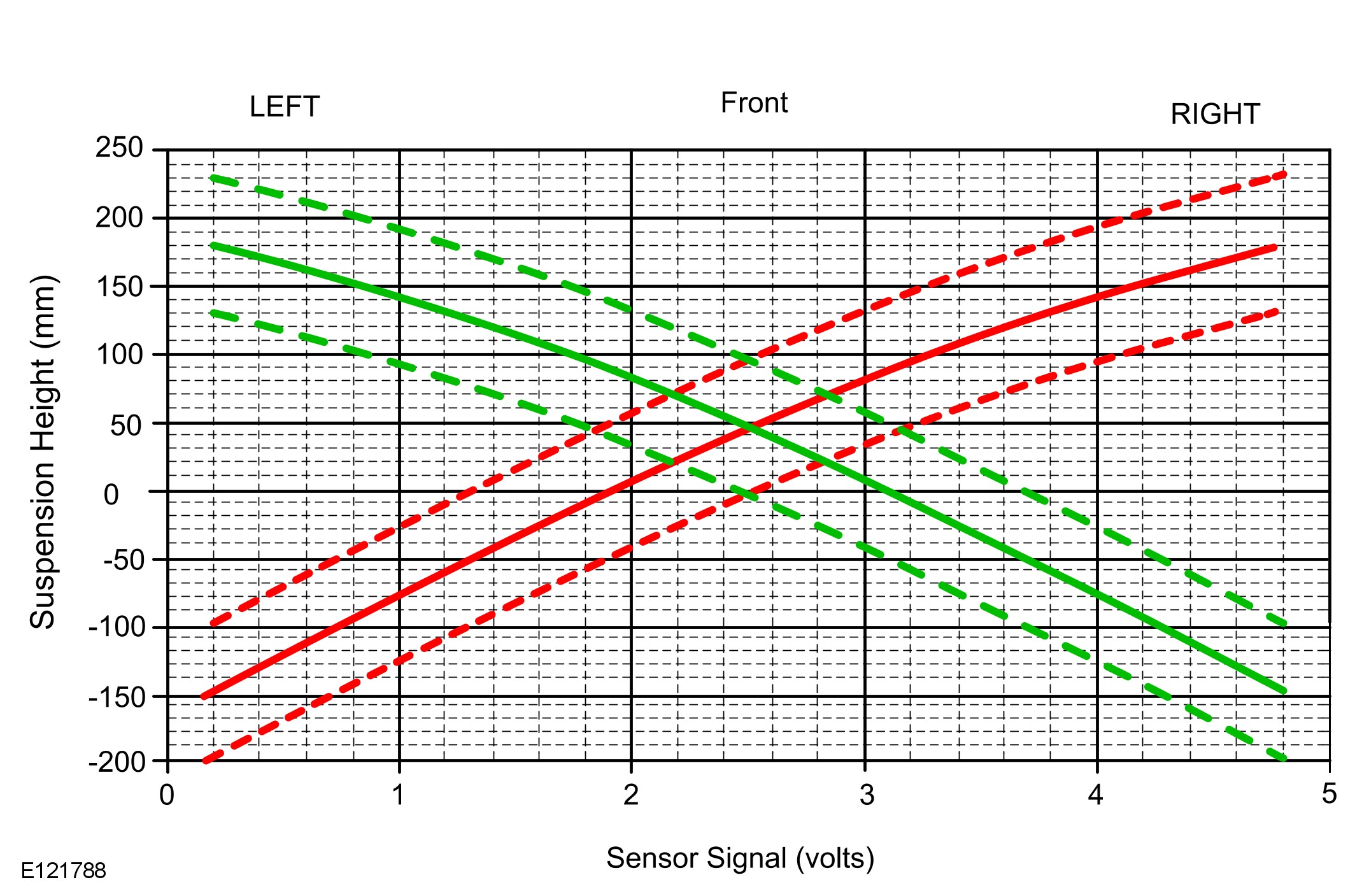 The following graph shows the vehicle height displacement from normal against output voltage for the front height sensors. The center line represents the "nominal" condition but depending on tolerances, the actual line may lie anywhere between the upper and lower lines.
