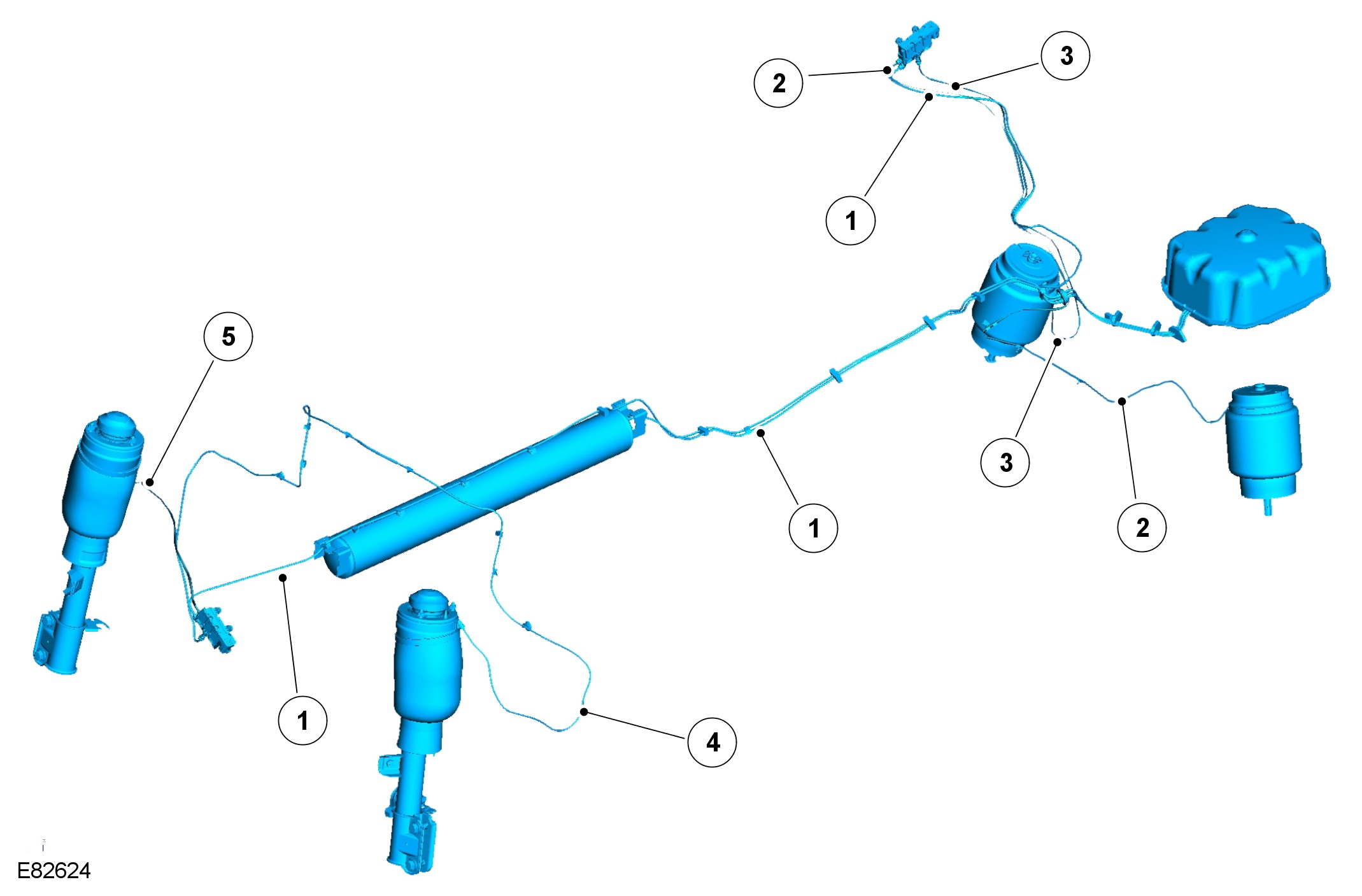The following schematic diagram shows the connection relationship between the air supply unit, the reservoir, the reservoir valve block, the cross-link valves and the air springs.
