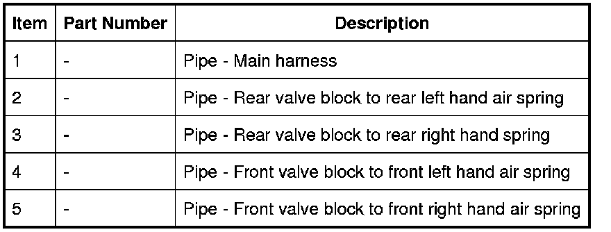 The air harness comprises a main harness which is located along the full length of the vehicle and connects the reservoir valve block to the front and rear valve blocks and the reservoir and four separate harnesses which are used to connect each valve block to the air springs.
