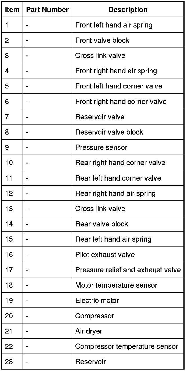 The air springs on the front and rear suspension are similar in construction. The air springs are manufactured from a flexible rubber and each air spring forms an air tight cavity which provides the required spring rate for each corner of the vehicle.