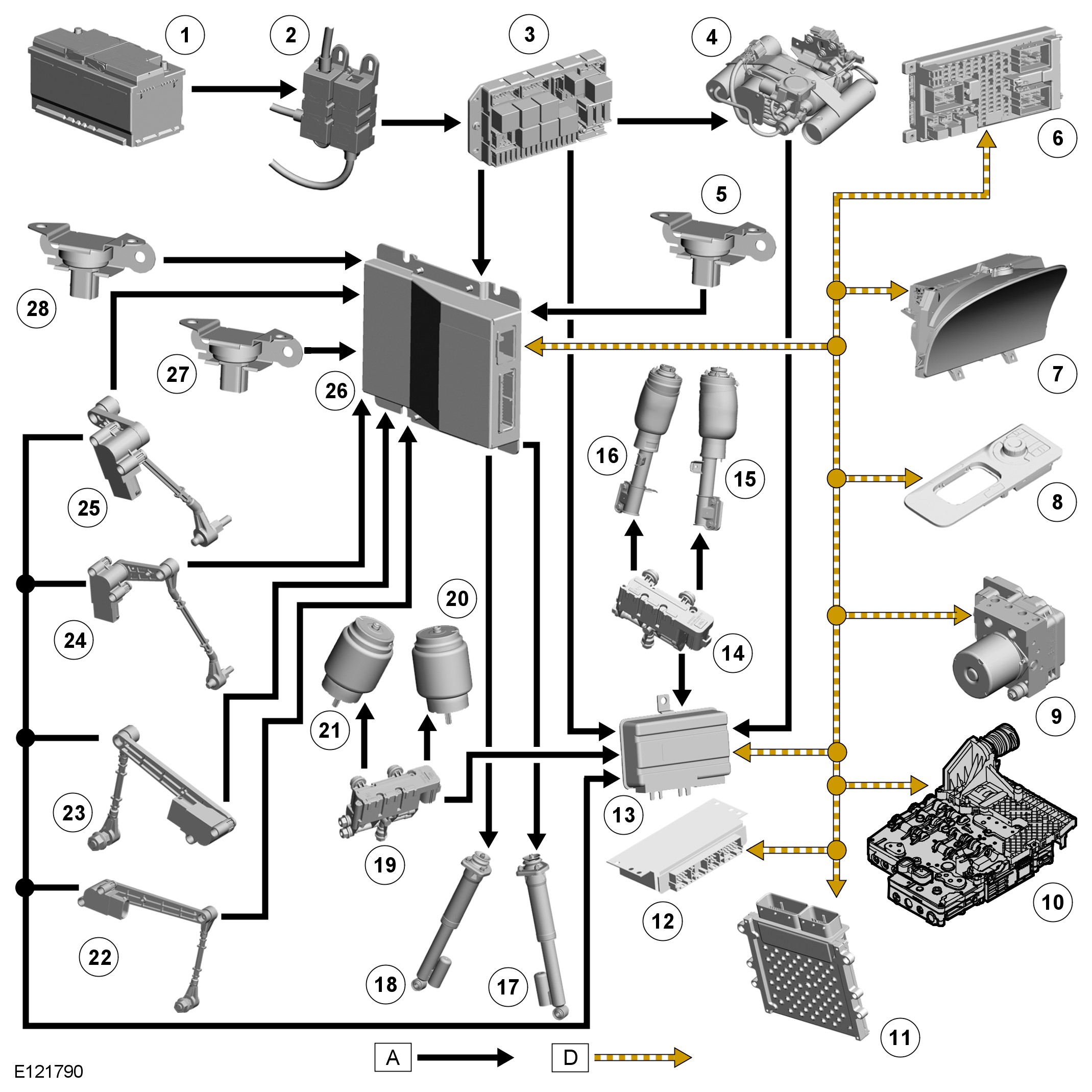 If the air suspension control module registers a cornering force greater than 0.2g it will inhibit all height changes and corrections. The system will remain inhibited until the cornering force falls to less than 0.15g. The air suspension control module receives a message from the lateral acceleration sensor (which is an integral part of the ABS (anti-lock brake system) yaw rate sensor) on the high speed CAN (controller area network) bus for the cornering force.
