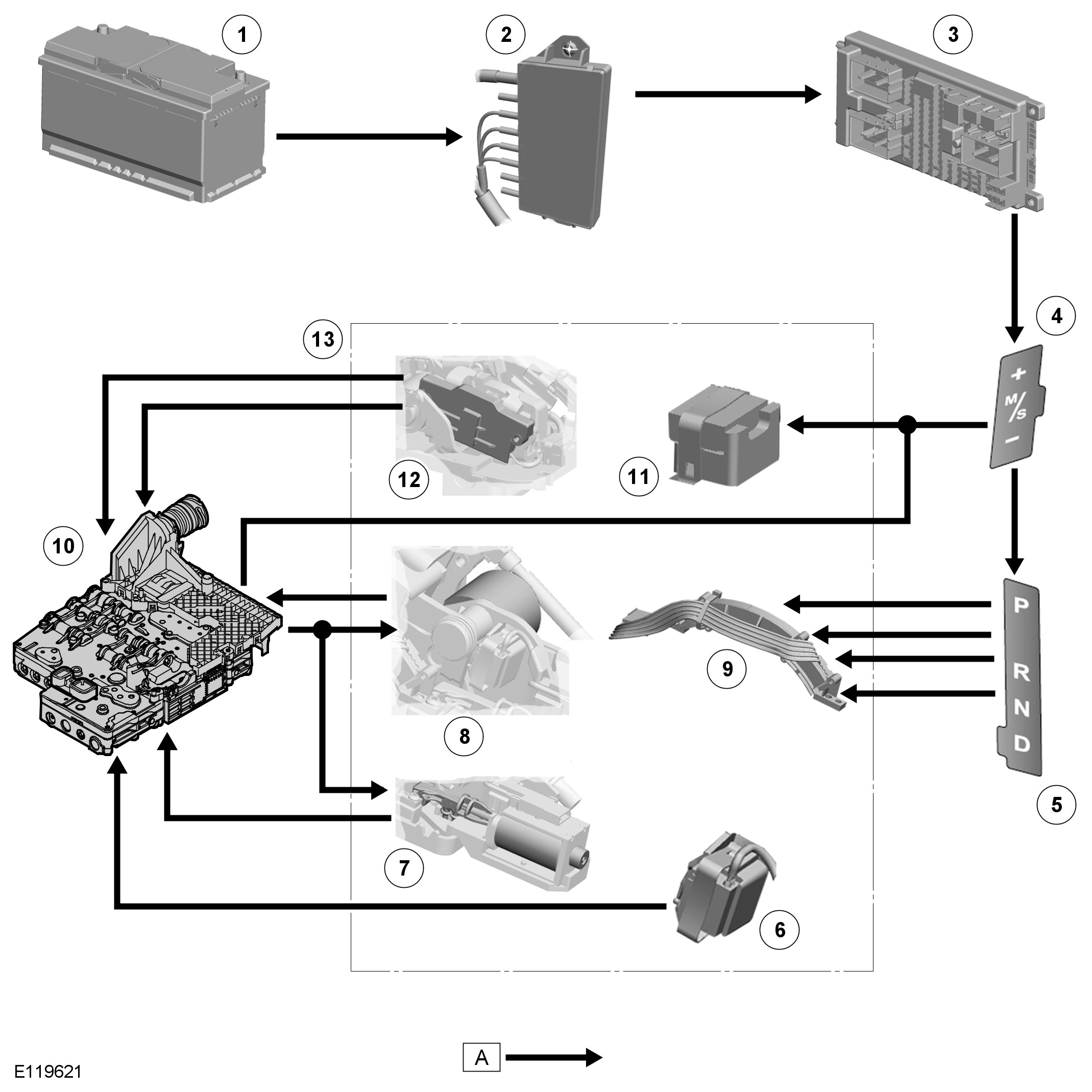 When the footbrake is applied, the ECM (engine control module) sends a high speed CAN (controller area network) message to the TCM (transmission control module), which de-energizes the solenoid allowing the lever to be moved from the P or N position. This prevents the selector lever from being moved to the D or R position unintentionally and the application of the brakes also prevents the vehicle 'creeping' when the gear is engaged.