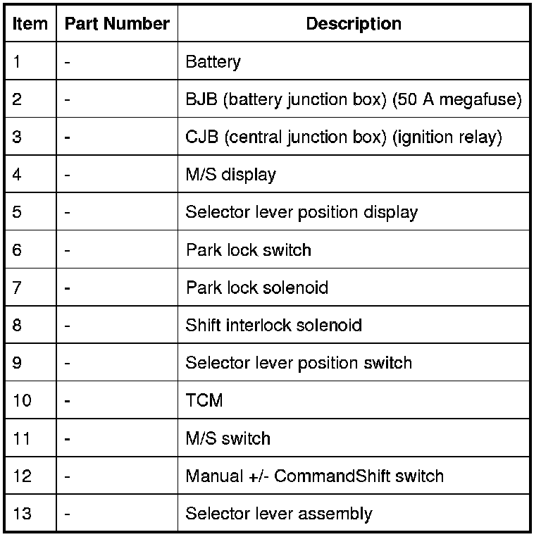 The LED (light emitting diode) has a power feed from the ignition relay in the CJB (central junction box) and a ground connection with the M/S switch. The M/S switch connects the LED (light emitting diode) to ground only when the selector lever is in the M/S position.