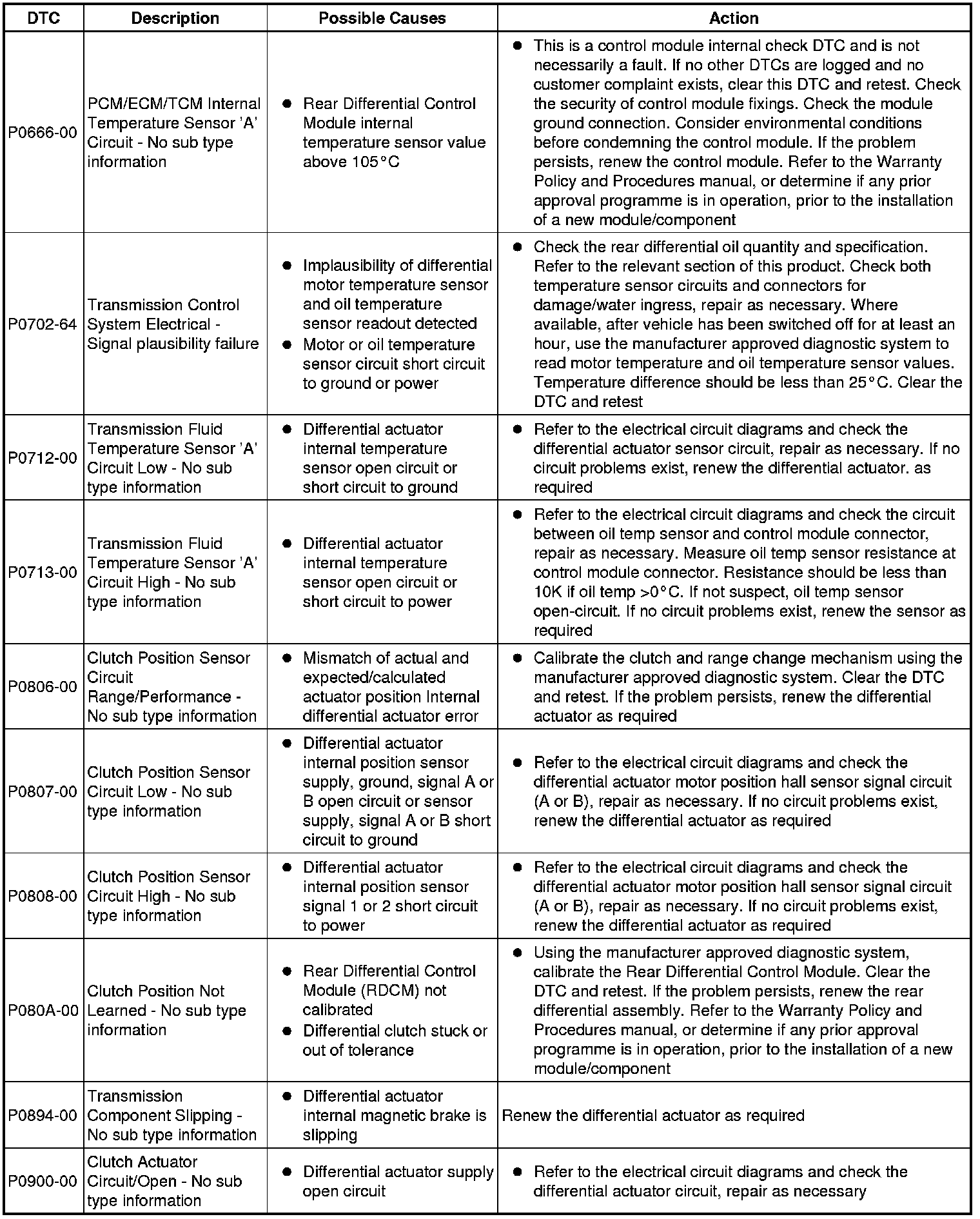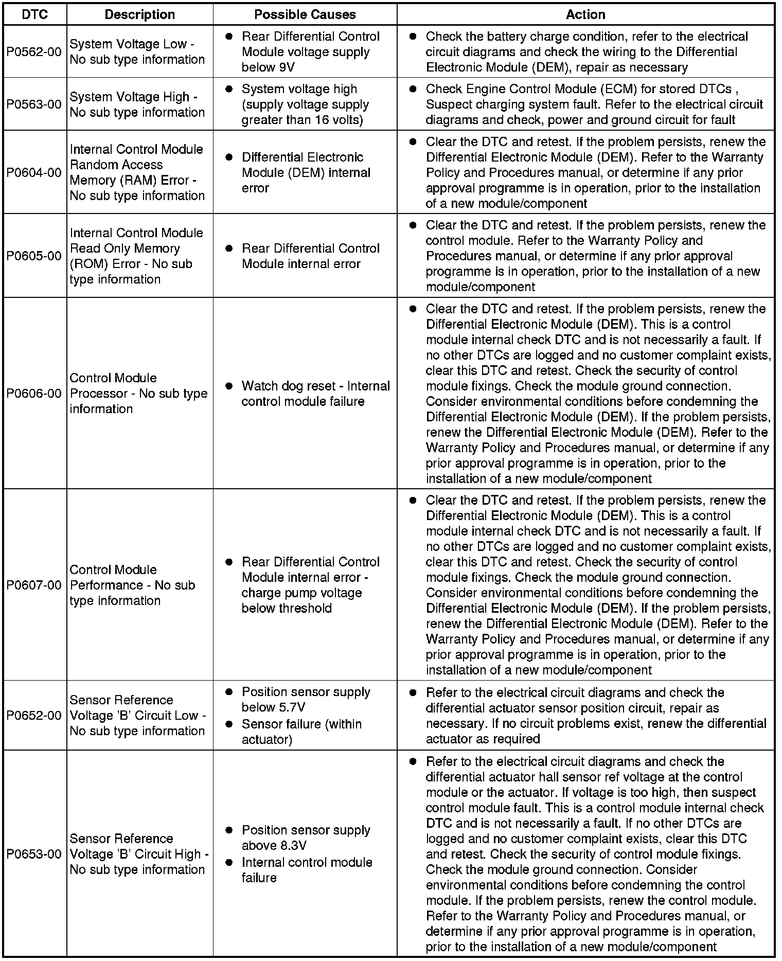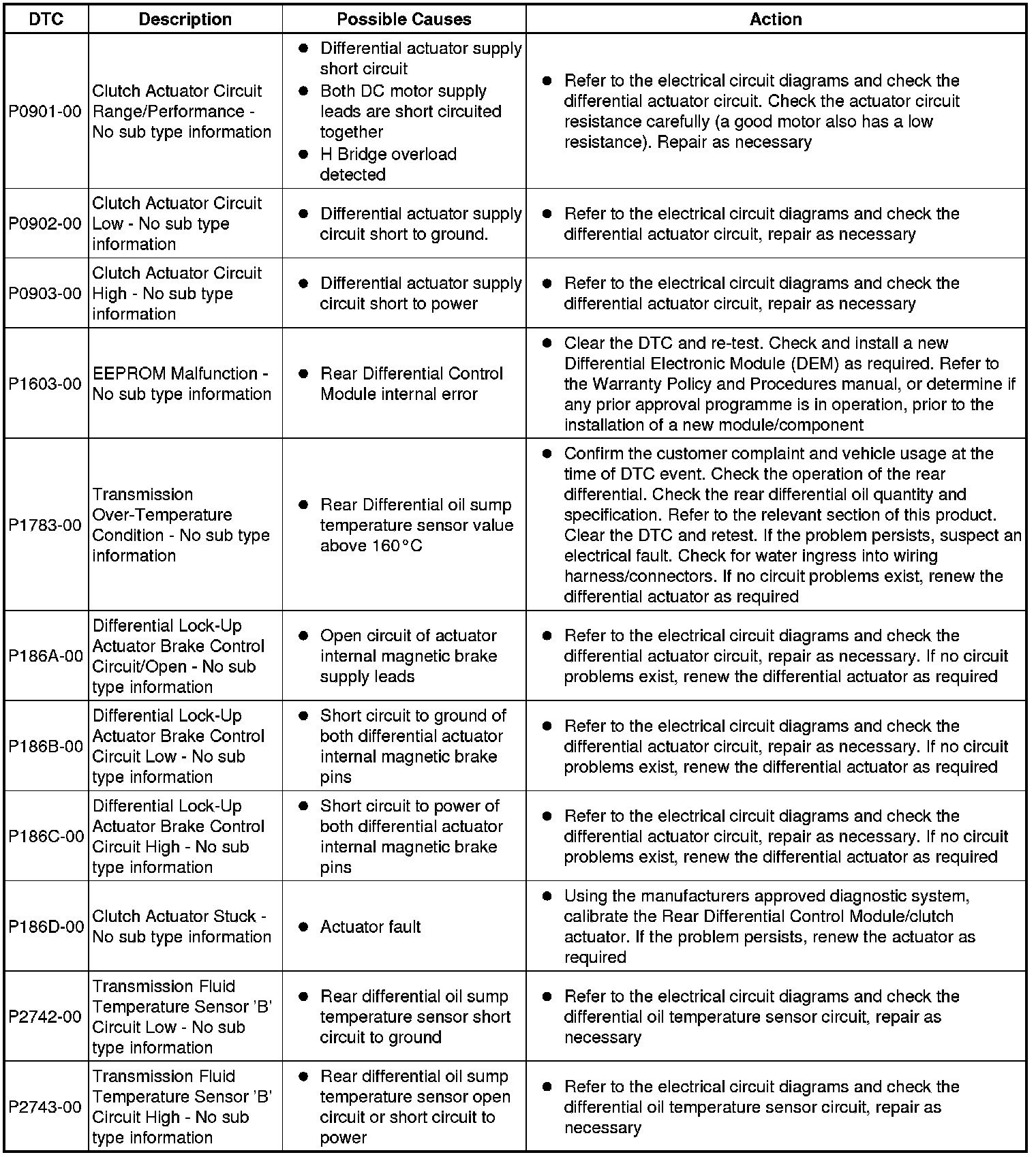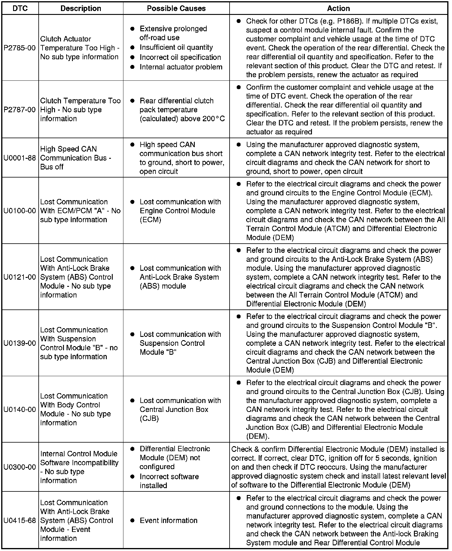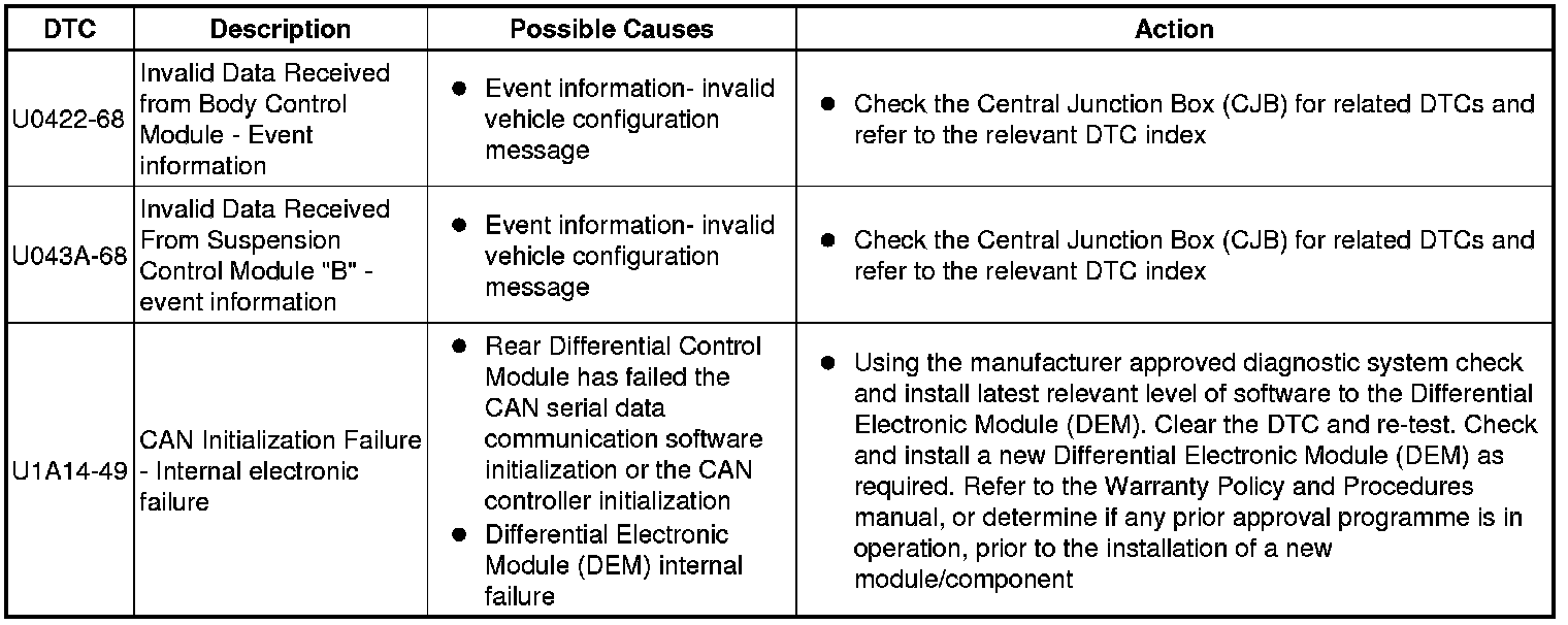The table below lists all Diagnostic Trouble Codes (DTCs) that could be logged in the Rear Differential Control Module, for additional Diagnosis and Testing information refer to the relevant Diagnosis and Testing Section. For additional information, refer to Rear Drive Axle and Differential