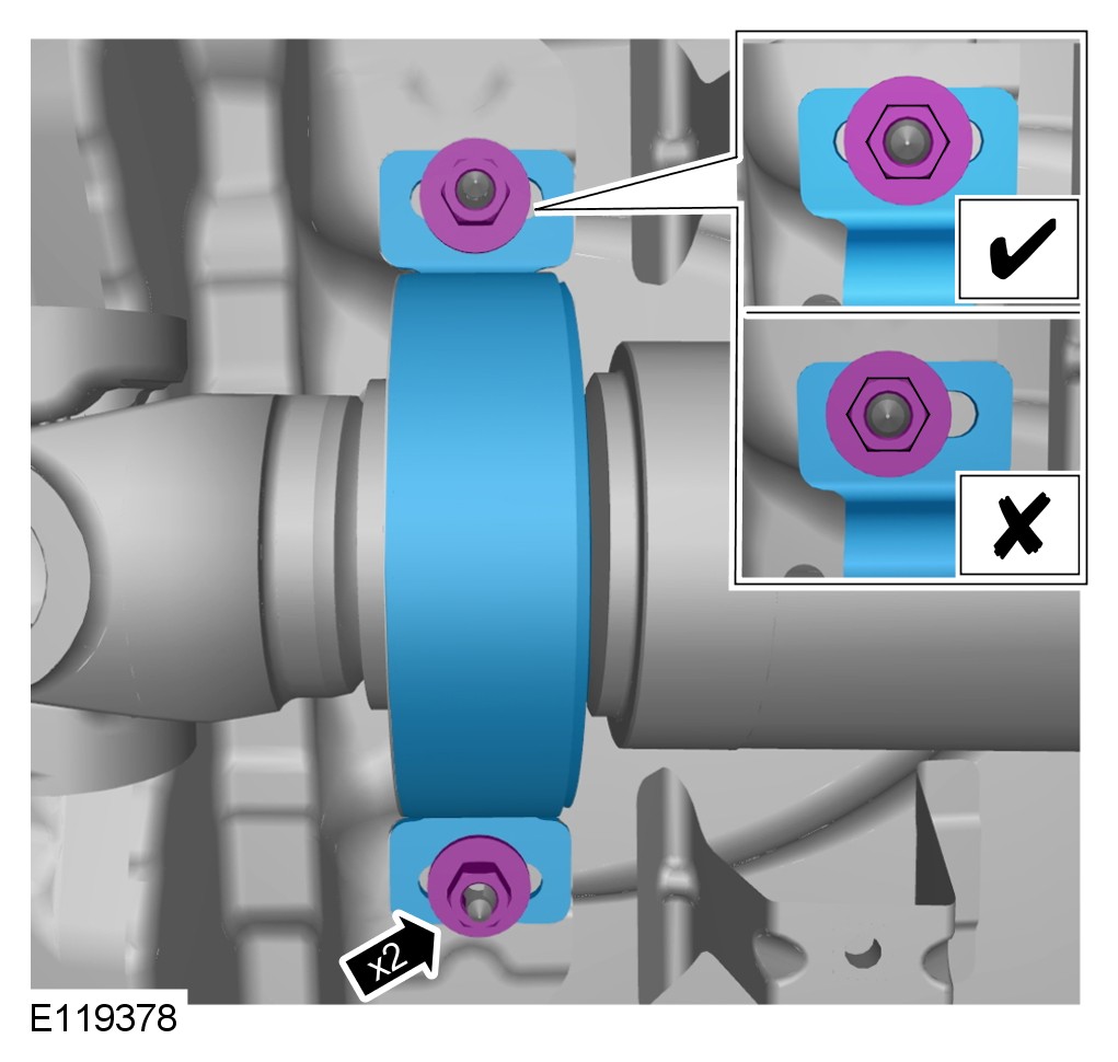 CAUTION: Make sure the center bearing mount is not under tension and central within the slots.