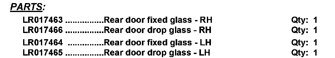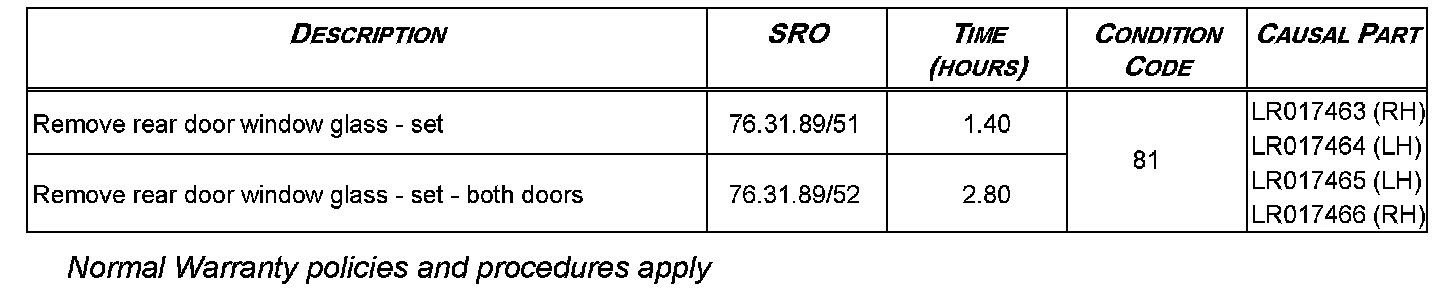 1. Refer to Workshop Manual 501-11: Glass, Frames, and Mechanisms, and replace the affected rear door fixed and drop window glass.