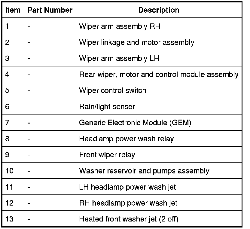 The wipers and washers system is controlled by the Generic Electronic Module (GEM) on receipt of requests made by the driver or the rain/light sensor unit (if fitted). All wiper functions for the front and rear wipers are controlled from a multifunction wash/wipe switch assembly located on the right hand side of the steering column.