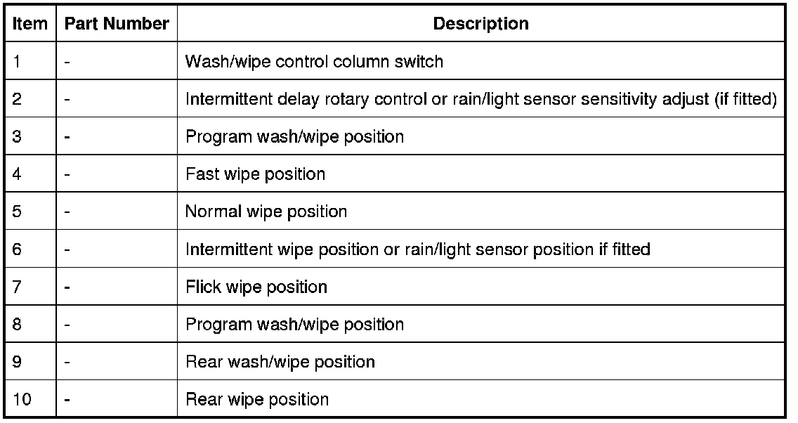 The wiper control column switch is located on the right hand side of the steering column and controls all front and rear wiper functions.