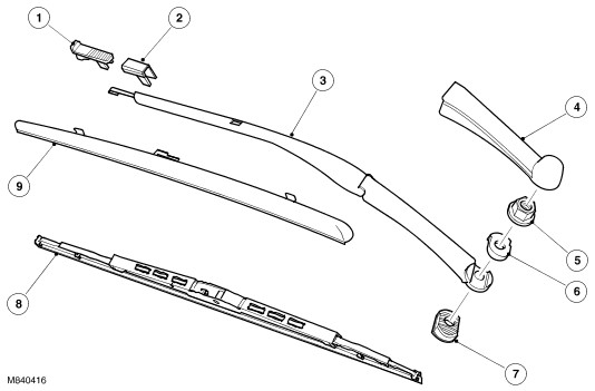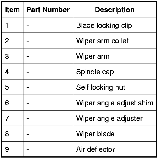 The wiper blades are attached to the wiper arms with clips that allow the blade to pivot. Each blade comprises a number of levers and yokes to which the rubber wiper blade is attached. The levers and yokes ensure that the pressure applied by the arm tension spring is distributed evenly along the full length of the blade and also allow the blade to adjust to the curvature and contour of the windscreen. The driver's side blade is fitted with an aerofoil, which presses the blade onto the windscreen at high speed, improving the wiper performance.