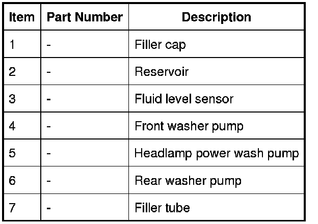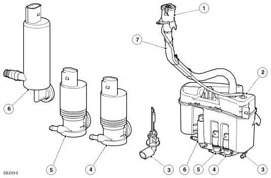 The windscreen washer system comprises a reservoir, a washer pump, 2 washer jets and hoses.