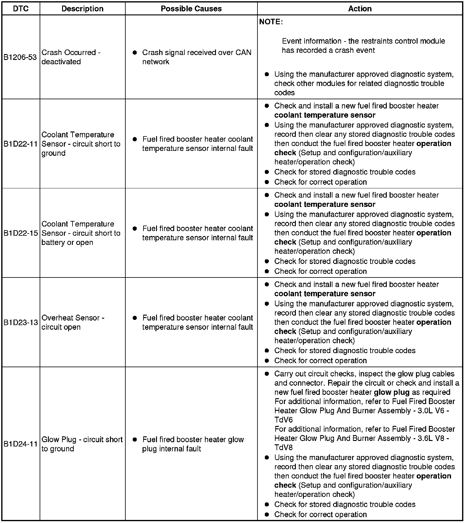 The table below lists all Diagnostic Trouble Codes (DTCs) that could be logged in the Fuel Fired Booster Heater Module, for additional Diagnosis and Testing information refer to the relevant Diagnosis and Testing Section. For additional information, refer to Fuel Fired Booster Heater Initial Inspection and Diagnostic Overview