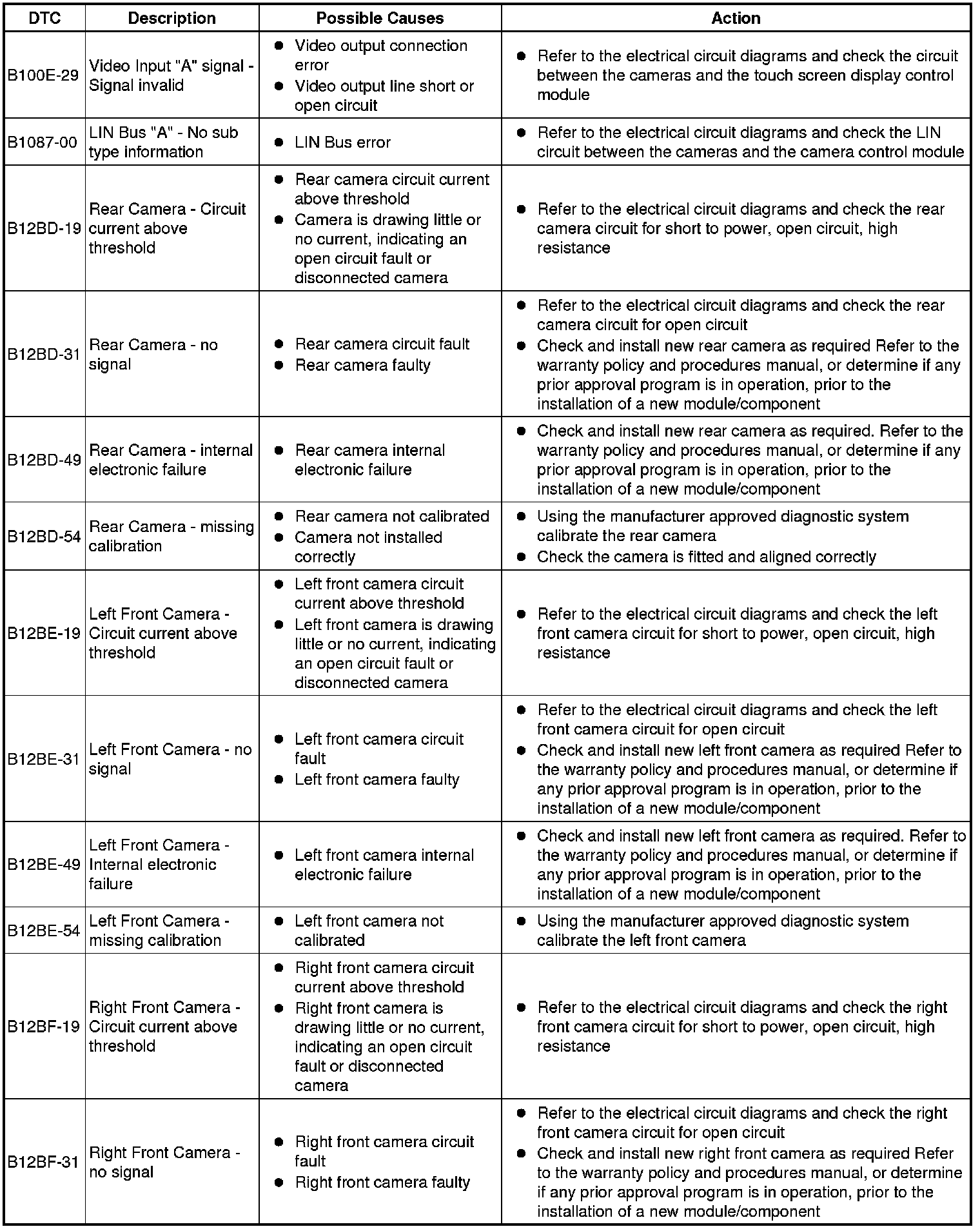 The table below lists all Diagnostic Trouble Codes (DTCs) that could be logged in the Image Processing Module, for additional Diagnosis and Testing information refer to the relevant Diagnosis and Testing Section. For additional information, refer to Video System Video System