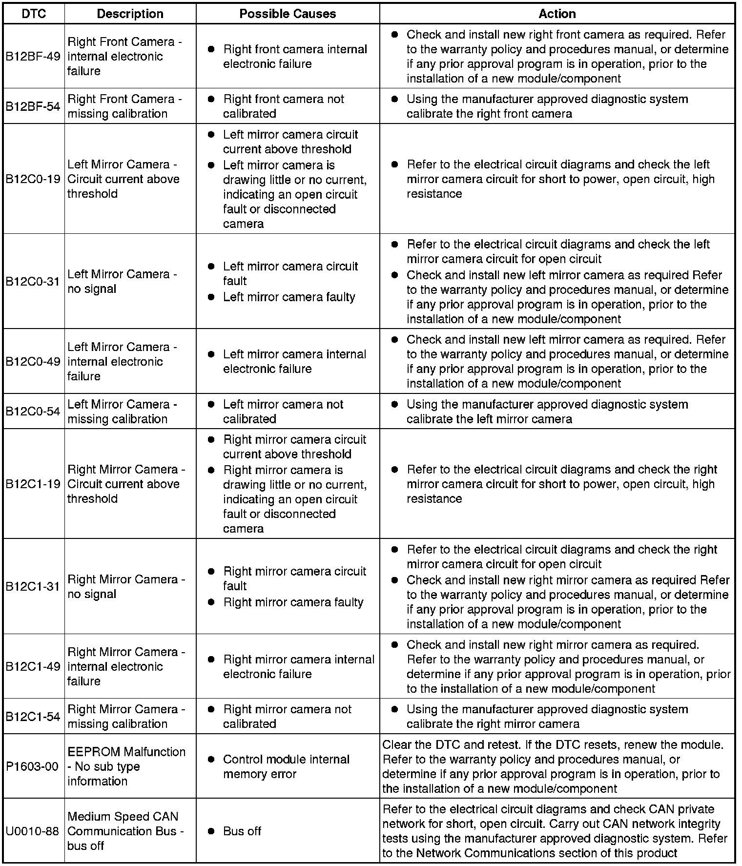 The table below lists all Diagnostic Trouble Codes (DTCs) that could be logged in the Image Processing Module, for additional Diagnosis and Testing information refer to the relevant Diagnosis and Testing Section. For additional information, refer to Video System Video System