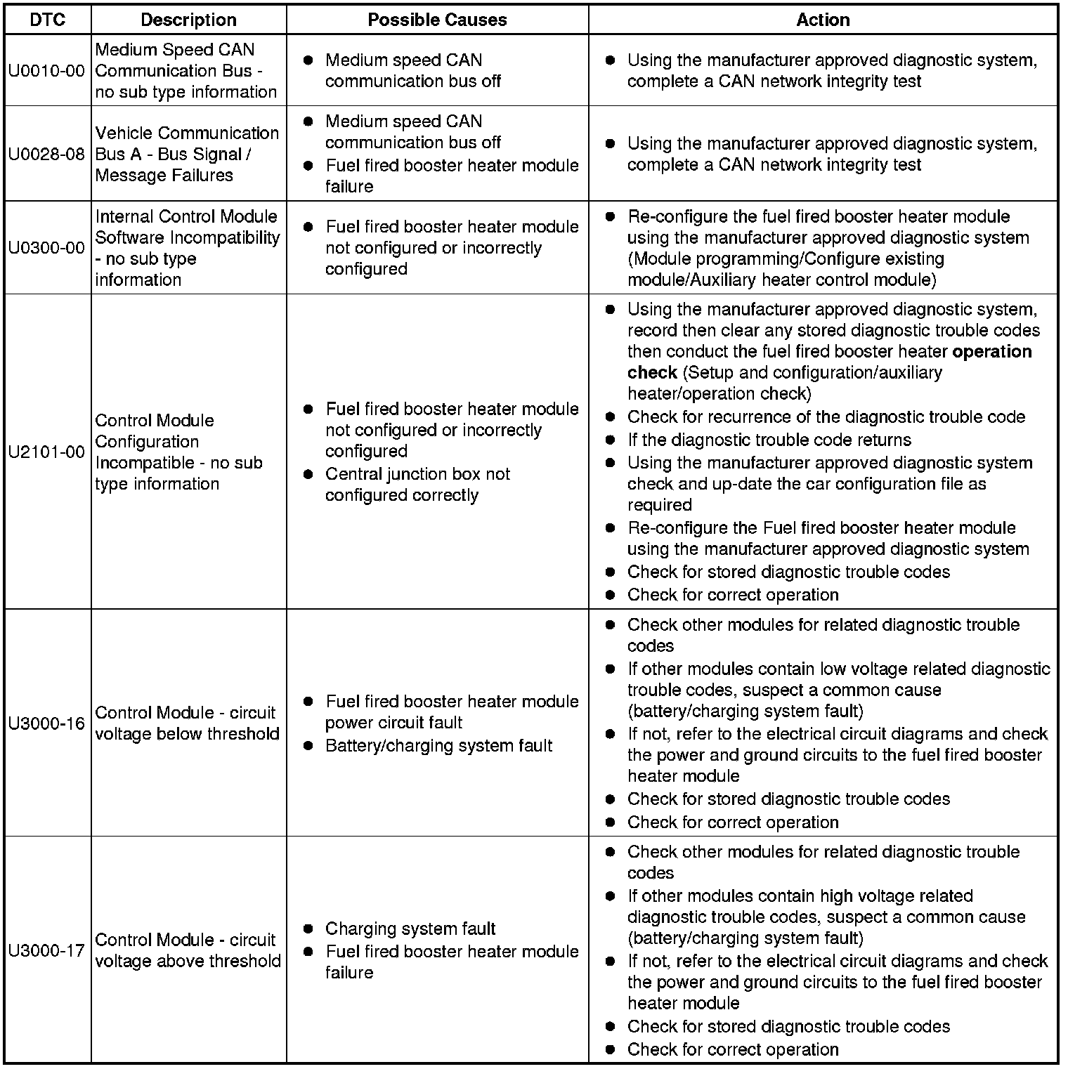 The table below lists all Diagnostic Trouble Codes (DTCs) that could be logged in the Fuel Fired Booster Heater Module, for additional Diagnosis and Testing information refer to the relevant Diagnosis and Testing Section. For additional information, refer to Fuel Fired Booster Heater Initial Inspection and Diagnostic Overview