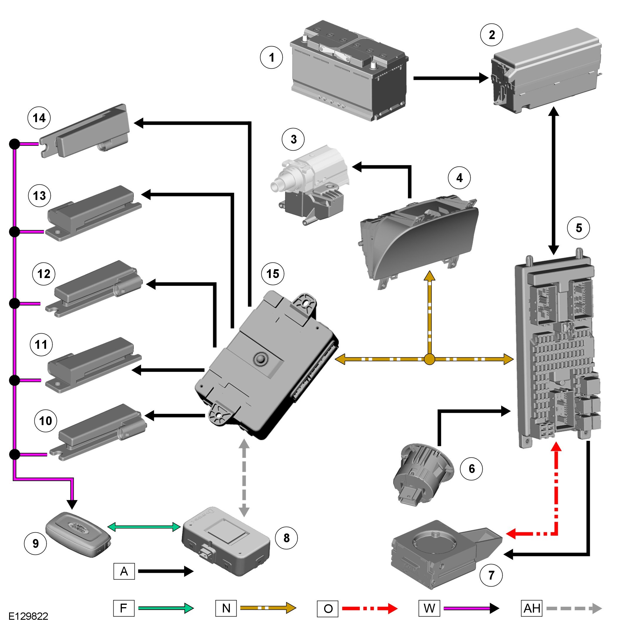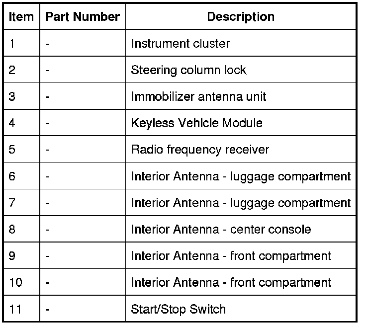 The passive start system relies on the detection of a uniquely coded Smart Key and low frequency antennas strategically situated within the vehicle. The antennas ensure the Smart Key is always within the active transmission zone of the antennas wherever the Smart Key is placed inside the vehicle. For this reason the orientation and positioning of the antennas is critical to the correct functioning of the system. The Smart Key also operates the passive entry system. For additional information, refer to Handles, Locks, Latches and Entry Systems